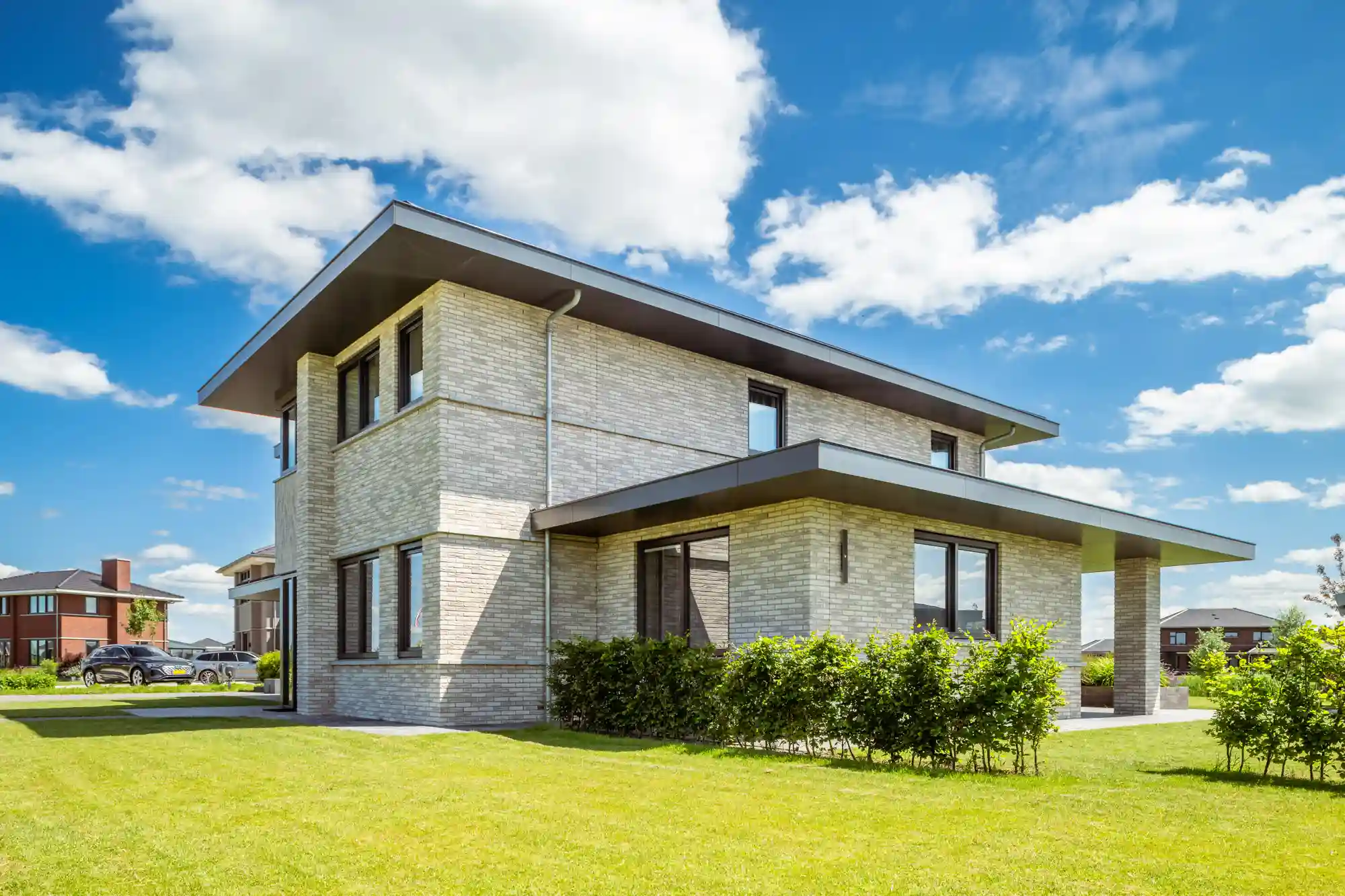 De woning is opgebouwd uit hoogwaardige materialen zoals licht metselwerk, donkere aluminium kozijnen en een houten voordeur. Dankzij de strakke belijning en platte dakvorm krijgt het ontwerp een eigentijdse uitstraling die perfect past bij de omgeving.